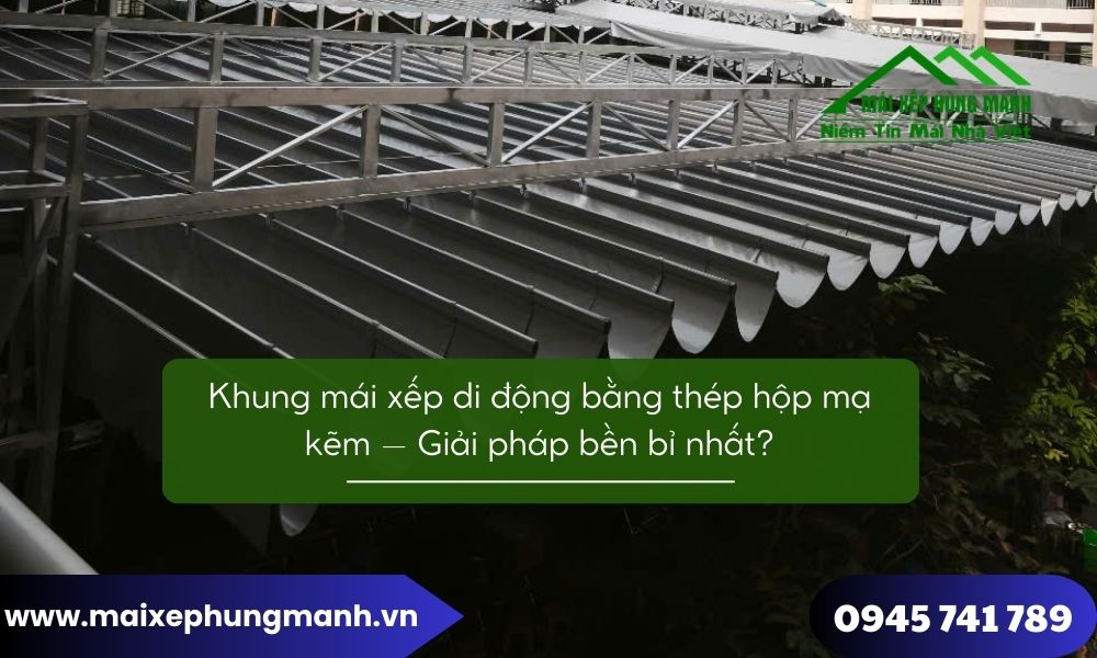 Đối với mái xếp di động, việc sử dụng thép hộp mạ kẽm giúp khung không bị gỉ sét nhanh, giữ được độ cứng và hình dáng ban đầu. Đây là lý do Mái xếp Hùng Mạnh lựa chọn loại vật liệu này cho các công trình mái xếp ngoài trời lâu dài.