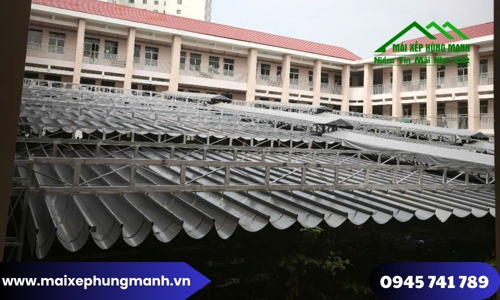 Tuy nhiên, với đặc thù ngân sách giáo dục luôn cần tối ưu chi phí, bài toán đặt ra không chỉ là che nắng mưa, mà còn là làm sao lắp đặt mái xếp hiệu quả – bền – tiết kiệm. Thực tế cho thấy, nếu lựa chọn đúng giải pháp kỹ thuật và mô hình thi công phù hợp, mái xếp di động hoàn toàn có thể trở thành phương án kinh tế lâu dài cho nhà trường. Đây cũng là định hướng mà Mái xếp Hùng Mạnh đã áp dụng trong nhiều công trình giáo dục thực tế.