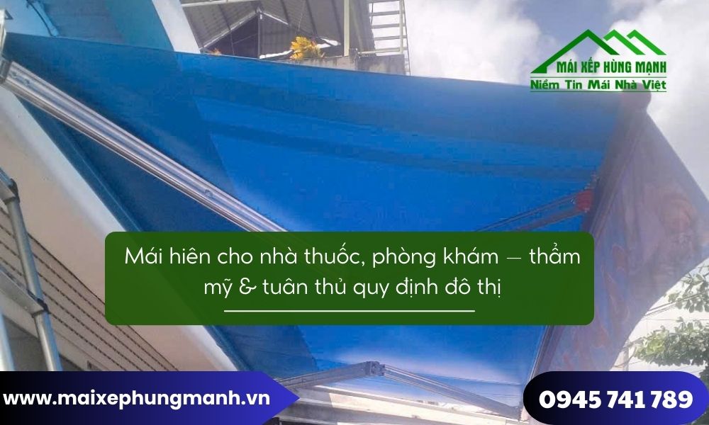 Mái hiên cho nhà thuốc, phòng khám là giải pháp vừa mang tính thẩm mỹ, vừa đáp ứng yêu cầu sử dụng và tuân thủ quy định đô thị. Khi được thiết kế đúng chuẩn và thi công bởi đơn vị uy tín như Mái xếp Hùng Mạnh, mái hiên không chỉ giúp che nắng mưa mà còn góp phần nâng cao hình ảnh chuyên nghiệp, thân thiện của cơ sở y tế trong mắt người dân.