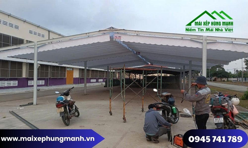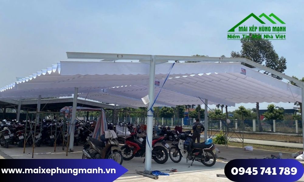 Lắp đặt mái hiên mái xếp di động cho bãi giữ xe bệnh viện giúp che phủ diện tích lớn với chi phí hợp lý, dễ mở rộng khi nhu cầu tăng. Các hệ mái do Mái xếp Hùng Mạnh thi công thường sử dụng bạt dày, khung thép chịu lực tốt, phù hợp cho bãi xe hoạt động cường độ cao và yêu cầu độ bền lâu dài.