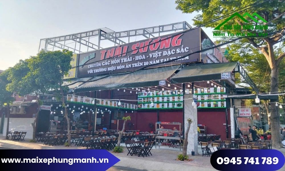 - Mái hiên có thể in logo, slogan hoặc tông màu nhận diện thương hiệu, giúp khách hàng dễ nhớ, dễ nhận biết khi đi ngang qua.