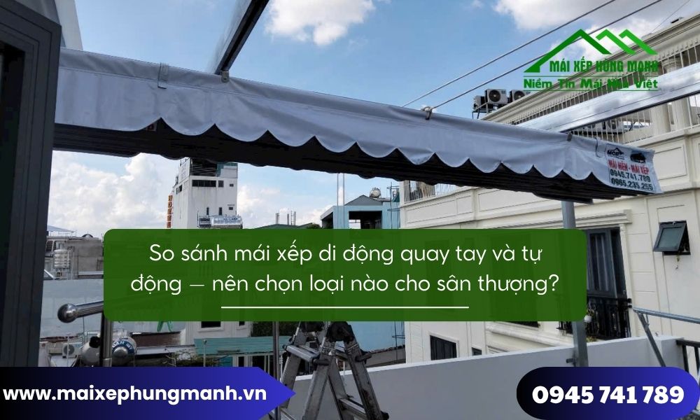 Mái quay tay chịu gió tốt, bền hơn vì không có linh kiện điện. Mái tự động êm ái, mượt mà nhưng dễ hỏng nếu không bảo dưỡng đúng cách.
