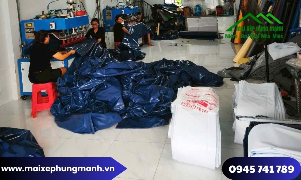 Các xưởng chuyên nghiệp sử dụng bạt nhựa PVC 3 lớp, có phủ UV, chống tia cực tím, chống co rút và thấm nước. Đường may được gia cố bằng máy công nghiệp chuyên dụng, bền đẹp theo thời gian.